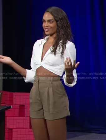 Michelle Young on The Bachelorette on ABC was spotted wearing this Michelle’s white cropped top and beige shorts on The Bachelorette on episode 'Week 2' (18x02) in Oct 2021. Michelle's Shoes is the Shiana Turned-up Cuff Linen-blend Shorts by Diane von Furstenberg . Michelle's Shoes is the Ethyl Low Top Sneaker by Sam Edelman.
