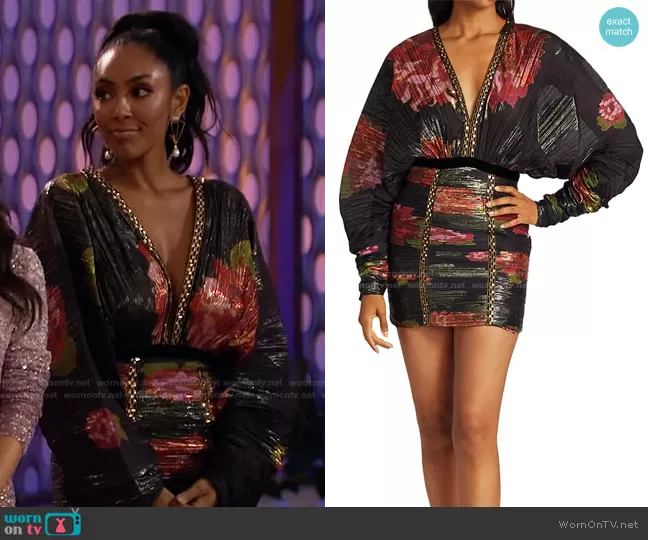 Tayshia Adams on The Bachelorette on ABC was spotted wearing this black floral v neck dress on The Bachelorette on episode 'Week 2' (18x02) in Oct 2021. Tayshia's Dress is the Balloon-Sleeves Pleated Deep V Mini Dress by Raisavanessa . Tayshia's Earrings is the Corset Earrings by Lilly Street.