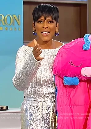 Tamron Hall on Tamron Hall Show on ABC was spotted wearing this silver metallic sweater and skirt on Tamron Hall Show on Oct 27 2021's episode. Tamron's Sweater is the Cropped metallic coated wool and Lyocell-blend sweater by Balmain . Tamron's Skirt is the Metallic Cable Knit Maxi-Skirt by Balmain.