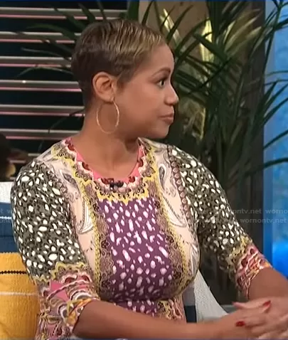 on E! News on E! was spotted wearing this Monique Kelley’s mixed print dress on E! News Daily Pop on Oct 27 2021's episode. 's Dress is the Delora Knit Bodycon Dress by Alice + Olivia.