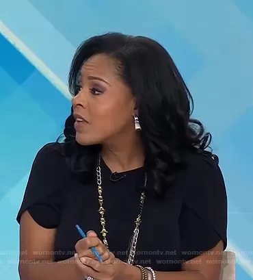 Sheinelle Jones on Today on NBC was spotted wearing this black tulip sleeve top on Today on Oct 28 2021's episode.