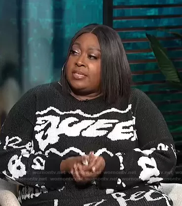 Loni Love on E! News on E! was spotted wearing this black queen print sweater dress on E! News Daily Pop on Oct 28 2021's episode. Loni's Dress is the Graffiti Queen Sweater Dress by Ashley Stewart.
