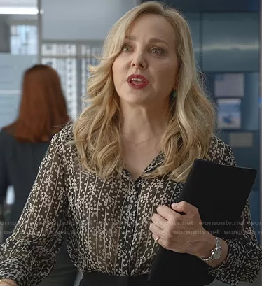 Marissa Morgan (played by Geneva Carr) on Bull on CBS was spotted wearing this black floral striped blouse on Bull on episode 'Uneasy Lies the Crown' (6x04) in Oct 2021. Marissa's Top is the Floral-Print Striped Shirt by Chloe.