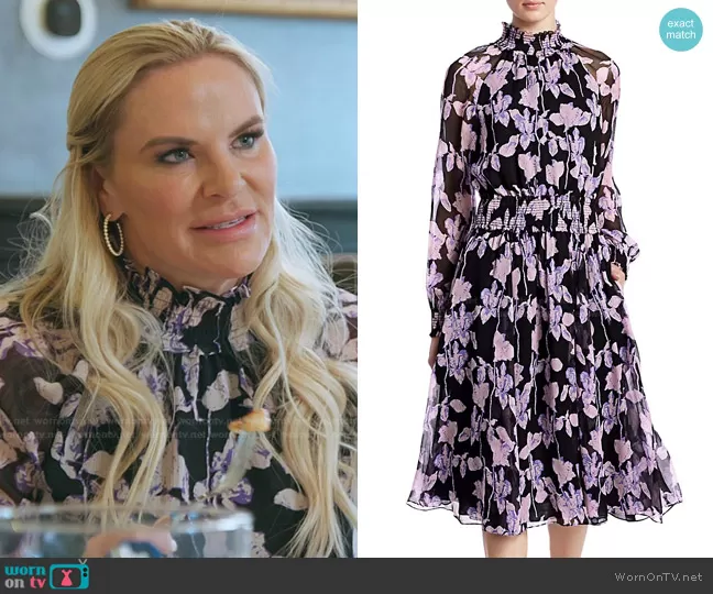 Heather Gay on The Real Housewives of Salt Lake City on Bravo was spotted wearing this black floral mock neck dress on The Real Housewives of Salt Lake City on episode 'A Wolf Pack Of Secrets' (2x08) in Nov 2021. Heather's Dress is the Athena Floral Silk Dress by Diane von Furstenberg . Heather's Bag is the Monogram Large Sukey Tote by Louis Vuitton.