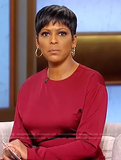 Tamron Hall on Tamron Hall Show on ABC was spotted wearing this burgundy midi dress on Tamron Hall Show on Nov 01 2021's episode. Tamron's Dress is the Dorothy Draped Crepe Midi Dress by Stella McCartney.