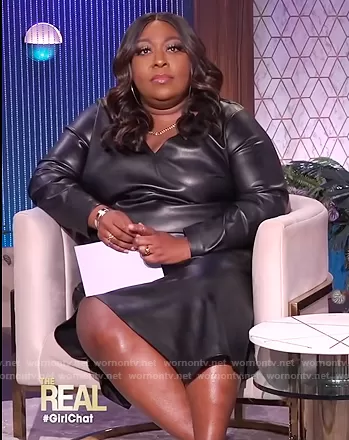 Loni Love on The Real on BETher was spotted wearing this black leather dress on The Real on Nov 01 2021's episode. Loni's Dress is the Faux Leather V-Neck Dress by Eloquii.