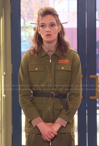 Presley (played by Jayden Bartels) on Side Hustle on Nickeldeon was spotted wearing this Presley’s green utility jacket on Side Hustle on episode 'Model Employee' (2x01) in Oct 2021. Presley's Jacket is the Utility Jacket by Karl Lagerfeld Paris.