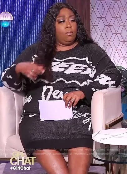 Loni Love on The Real on BETher was spotted wearing this black graffiti print sweater dress on The Real on Nov 01 2021's episode. Loni's Dress is the Graffiti Queen Sweater Dress by Ashley Stewart.