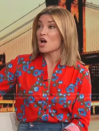 Kit Hoover on Access Hollywood on NBC was spotted wearing this red floral blouse on Access Hollywood on Nov 02 2021's episode. Kit's Top is the Classic-Fit Shirt in Lattice Floral by J. Crew.