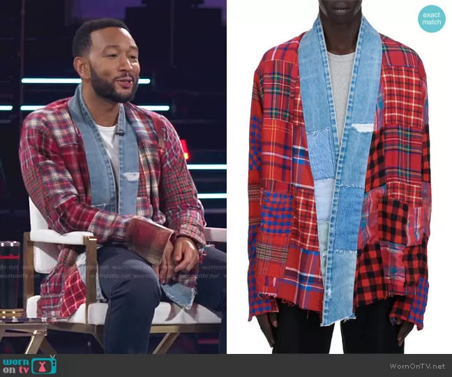 John Legend on The Voice on NBC was spotted wearing this John’s red plaid and denim patchwork jacket on The Voice on Nov 02 2021's episode. John's Jacket is the Plaid Scrapwork Kimono Jacket by Greg Lauren.