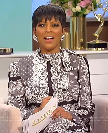 Tamron Hall on Tamron Hall Show on ABC was spotted wearing this gray printed tie neck blouse and pants on Tamron Hall Show on Nov 02 2021's episode. Tamron's Top is the Pussy-bow Printed Silk Blouse by Red Valentino . Tamron's Pants is the Printed silk straight-leg pants by Red Valentino.