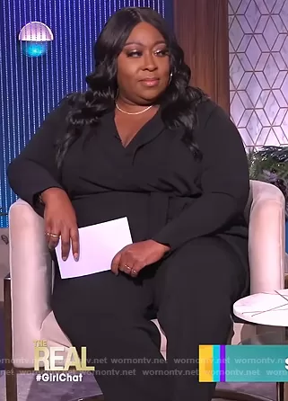 Loni Love on The Real on BETher was spotted wearing this black wrap jumpsuit on The Real on Nov 03 2021's episode. Loni's Jumpsuit is the Relaxed Shawl Collar Jumpsuit by Eloquii.