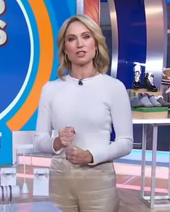 Amy Robach on Good Morning America on ABC was spotted wearing this white ribbed sweater on Good Morning America on Nov 03 2021's episode. Amy's Sweater is the Marled Rib Crew Sweater by Vince.