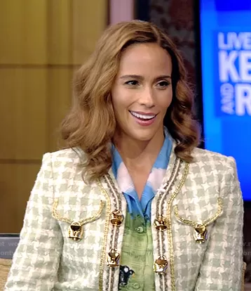 on Live with Kelly and Mark on Disney ABC Home Entertainment was spotted wearing this cow print blouse and tweed jacket on Live with Kelly and Ryan on Nov 03 2021's episode. 's Top is the Farm-Print Checked Jacquard Shirt by Moschino . 's Jacket is the Cowbells Two Tone Tweed Jacket by Moschino . 's Skirt is the Cowbells Two Tone Tweed Skirt by Moschino.