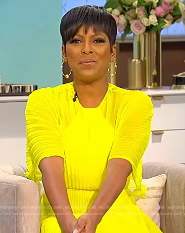 Tamron Hall on Tamron Hall Show on ABC was spotted wearing this neon yellow pleated dress on Tamron Hall Show on Nov 03 2021's episode. Tamron's Dress is the Pleated neon silk-chiffon maxi dress by Brandon Maxwell.