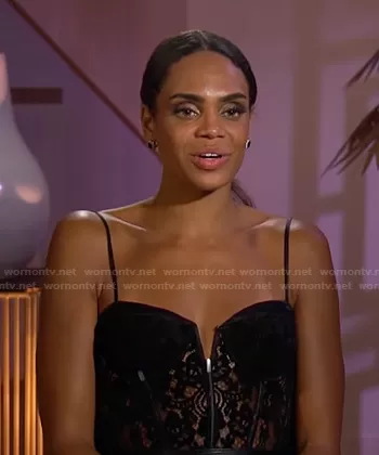 Michelle Young on The Bachelorette on ABC was spotted wearing this black lace corset top on The Bachelorette on episode 'Week 3' (18x03) in Nov 2021. Michelle's Bodysuit is the The Anne Lace Bodysuit by Cami NYC.
