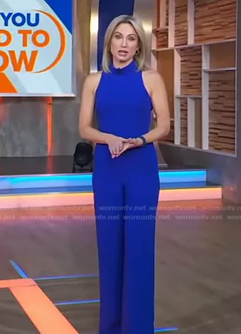 Amy Robach on Good Morning America on ABC was spotted wearing this blue sleeveless jumpsuit on Good Morning America on Nov 04 2021's episode. Amy's Jumpsuit is the Dory Jumpsuit by Reiss.