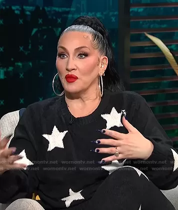 on E! News on E! was spotted wearing this black star print sweater and pants on E! News Daily Pop on Nov 04 2021's episode. 's Sweater is the Melody Sweater by Spiritual Gangster . 's Pants is the Serenity Jogger by Spiritual Gangster.