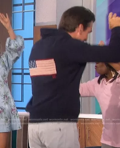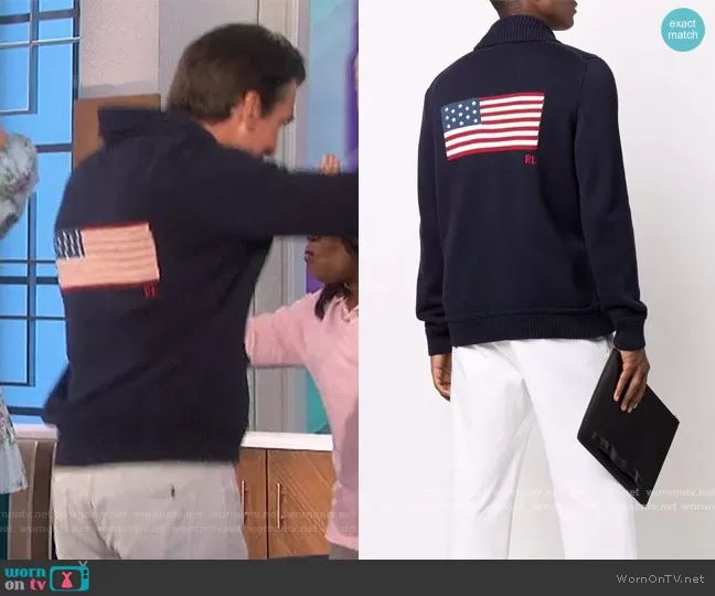 Jerry O'Connell on The Talk on CBS was spotted wearing this navy American flag cardigan on The Talk on Nov 05 2021's episode. Jerry's Sweater is the Button-up Knitted Cardigan by Ralph Lauren.
