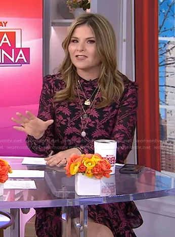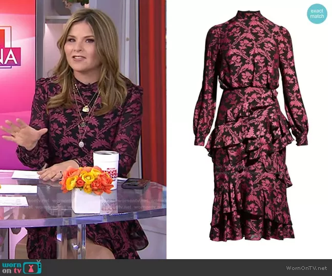 Jenna Bush Hager on Today on NBC was spotted wearing this black and pink floral print dress on Today on Dec 27 2021's episode. Jenna's Dress is the Isa Ruffled Midi Dress by Saloni.