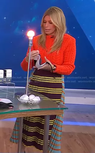Jill Martin on Today on NBC was spotted wearing this orange sweater and striped pleated skirt on Today on Nov 08 2021's episode. Jill's Sweater is the Wool Cropped Sweater by Philosophy di Lorenzo Serafini . Jill's Skirt is the Pleated Striped Gabardine Midi Skirt by Philosophy di Lorenzo Serafini.
