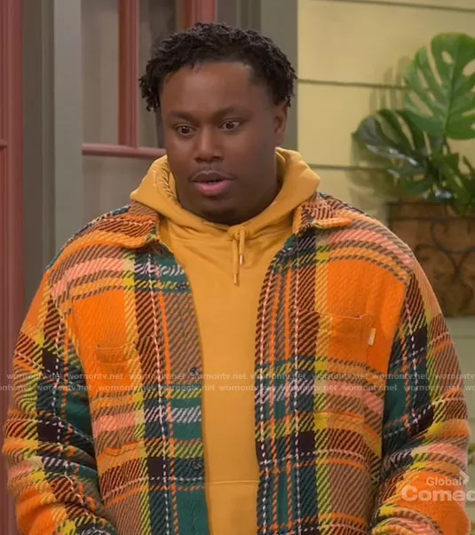 Marty (played by Marcel Spears) on The Neighborhood on CBS was spotted wearing this orange plaid overshirt on The Neighborhood on episode 'Welcome to the Ex-Files' (4x07) in Nov 2021. Marty's Shirt is the Exploded Twill Work Overshirt in Orange by Urban Outfitters.