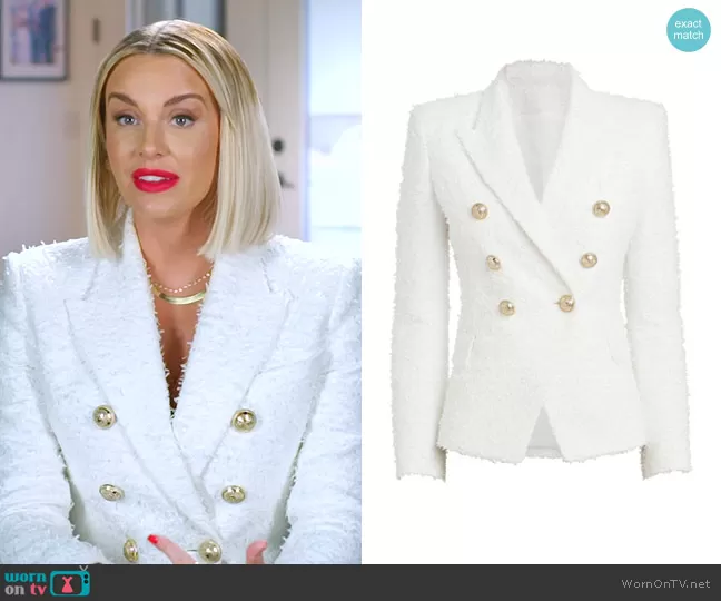 Whitney Rose on The Real Housewives of Salt Lake City on Bravo was spotted wearing this white tweed blazer on The Real Housewives of Salt Lake City on episode 'A Wolf Pack Of Secrets' (2x08) in Nov 2021. Whitney's Jacket is the Double-Breasted Tweed Blazer by Balmain.
