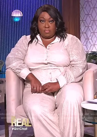 Loni Love on The Real on BETher was spotted wearing this ivory sequin embellished jumpsuit on The Real on Nov 09 2021's episode. Loni's Jumpsuit is the Sequin Jumpsuit With Collar by Eloquii.