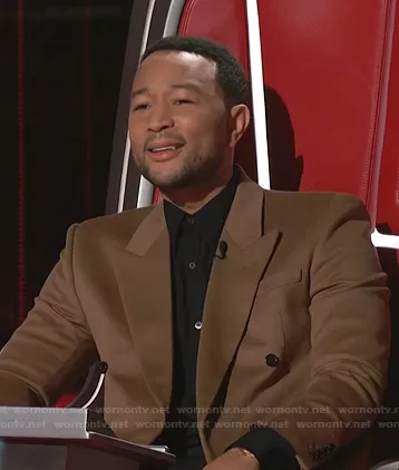John Legend on The Voice on NBC was spotted wearing this beige double breasted blazer on The Voice on Nov 09 2021's episode. John's Jacket is the Double-Breasted Blazer by Saint Laurent.