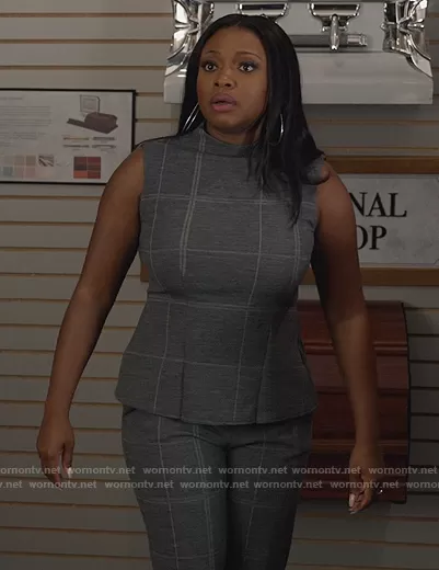 Jill (played by Naturi Naughton) on Queens on ABC was spotted wearing this gray check top and pants on Queens on episode 'Ain't No Sunshine' (1x04) in Nov 2021. Jill's Top is the Volume Top by Theory . Jill's Pants is the Treeca Pull Pants by Theory.
