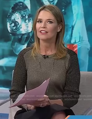 Savannah Guthrie on Today on NBC was spotted wearing this metallic colorblock sweater on Today on Nov 10 2021's episode. Savannah's Sweater is the Remi Two-Tone Metallic Stretch-Knit Sweater by Cefinn . Savannah's Shoes is the Block Heel Loafer Pump by Prada.