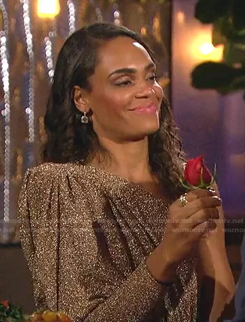Michelle Young on The Bachelorette on ABC was spotted wearing this Michelle’s lurex one-shoulder dress on The Bachelorette on episode 'Week 4' (18x04) in Nov 2021. Michelle's Dress is the Lurex One Shoulder Maxi Dress by PatBo . Michelle's Shoes is the Sophie Sandals by Giuseppe Zanotti.