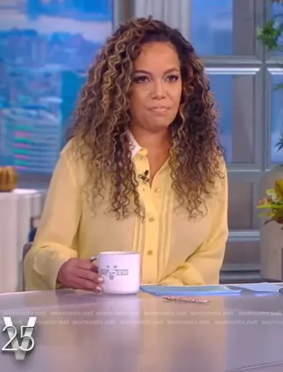 Sunny Hostin on The View on ABC was spotted wearing this yellow pleated front blouse on The View on Nov 11 2021's episode. Sunny's Top is the Lace Overlay Collar Button-Down Shirt by Chloe.
