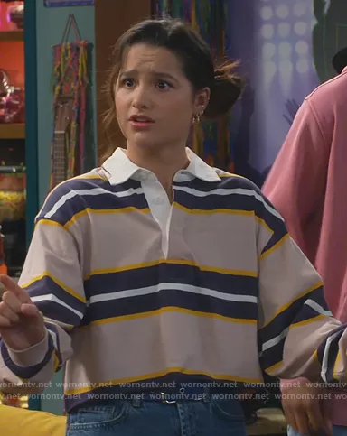 Lex (played by Jules LeBlanc) on Side Hustle on Nickeldeon was spotted wearing this stripe rugby top on Side Hustle on episode 'Al-Dude-isburg' (2x04) in Nov 2021. Lex's Top is the Jefferson Cropped Rugby Shirt by Urban Outfitters.