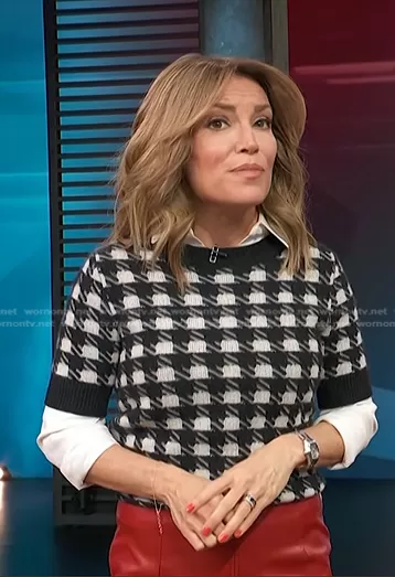 Kit Hoover on Access Hollywood on NBC was spotted wearing this black check short sleeve sweater on Access Hollywood on Feb 27 2023's episode. Kit's Sweater is the Houndstooth Short Sleeve Sweater by Gucci.