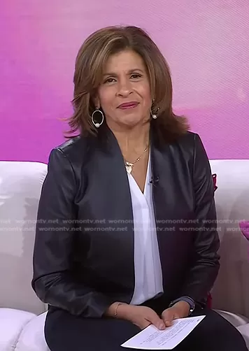 Hoda Kotb on Today on NBC was spotted wearing this black open leather jacket on Today on Feb 09 2023's episode. Hoda's Jacket is the Harvey Leather Blazer by Alice + Olivia.