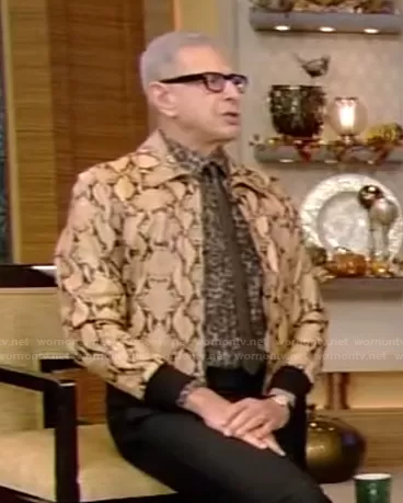 on Live with Kelly and Mark on Disney ABC Home Entertainment was spotted wearing this Jeff Goldblum’s snake print leather jacket on Live with Kelly and Ryan on Nov 12 2021's episode. 's Jacket is the Snakeskin Print Bomber Jacket in Camel by Celine.