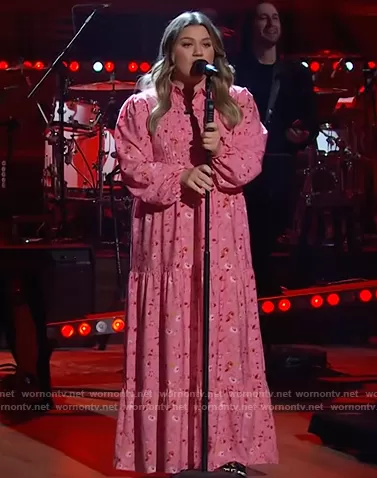 Kelly Clarkson on The Kelly Clarkson Show on NBC was spotted wearing this pink floral maxi dress on The Kelly Clarkson Show on Nov 15 2021's episode. Kelly's Dress is the Maxi Shirt Dress with pin Tuck in Flirty Floral Print by ASOS.