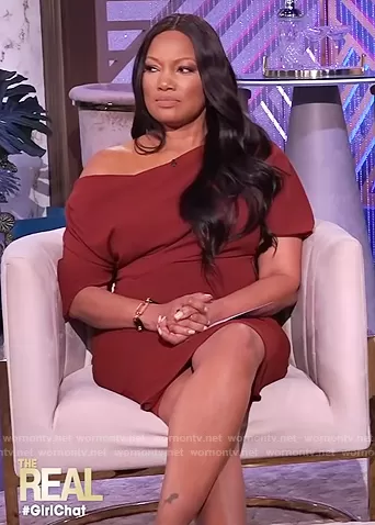 Garcelle Beauvais on The Real on BETher was spotted wearing this burgundy off shoulder dress on The Real on Nov 15 2021's episode. Garcelle's Dress is the Olivia Drapped One Shoulder Sheath by Alexia Admor.