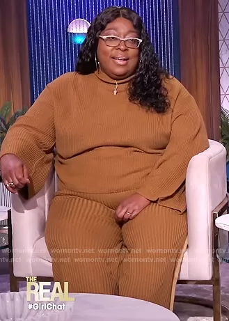 Loni Love on The Real on BETher was spotted wearing this brown ribbed sweater and stripe pants on The Real on Nov 15 2021's episode. Loni's Sweater is the Side Stripe Sweater by Eloquii . Loni's Pants is the Work Side Stripe Pant by Eloquii.