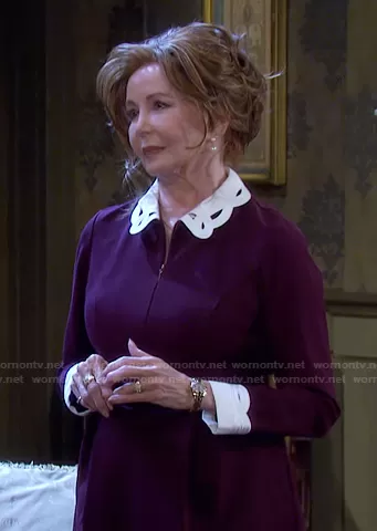 Maggie Horton (played by Suzanne Rogers) on Days of our Lives on Peacock was spotted wearing this Maggie’s burgundy dress with white collar on Days of our Lives on Nov 16 2021's episode. Maggie's Dress is the Shealah Dress by Ted Baker.