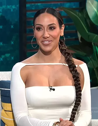 on E! News on E! was spotted wearing this white cutout long sleeve top on E! News Daily Pop on Nov 15 2021's episode. 's Top is the Lucciu Top by Jacquemus.