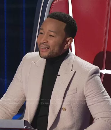 on The Voice on NBC was spotted wearing this white double breasted blazer on The Voice on Nov 16 2021's episode. 's Jacket is the Double-Breasted Felted-Wool Blend Suit Jacket by Amiri.