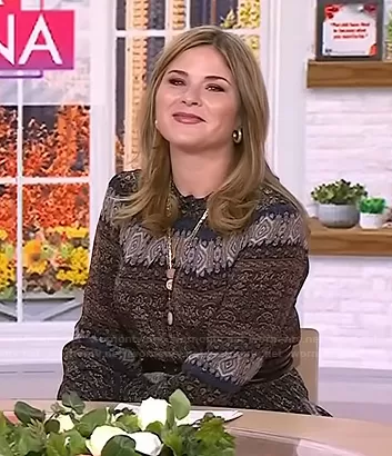 Jenna Bush Hager on Today on NBC was spotted wearing this brown printed dress on Today on Nov 16 2021's episode. Jenna's Dress is the Santana Printed Dress by Vanessa Bruno.