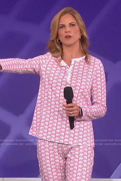 Natalie Morales on The Talk on CBS was spotted wearing this pink elephant print pajamas on The Talk on Nov 16 2021's episode. Natalie's Pajamas is the Elephant Pajama Set by Roller Rabbit.