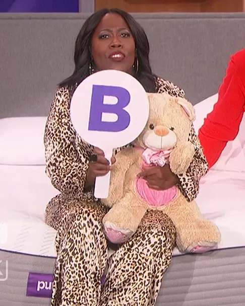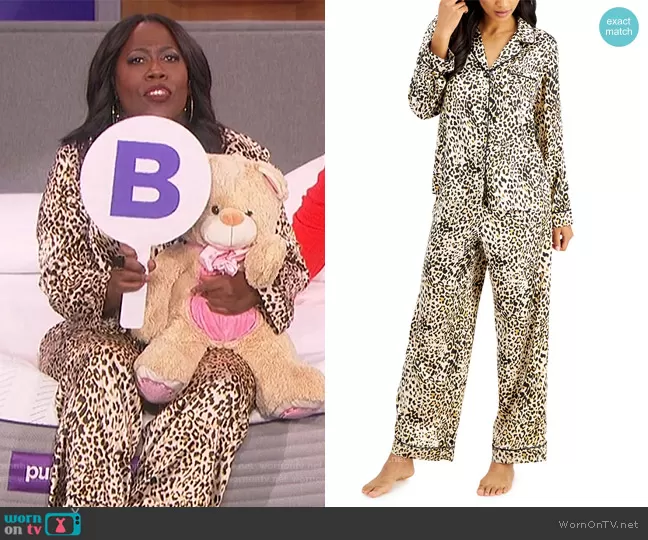 Sheryl Underwood on The Talk on CBS was spotted wearing this leopard satin pajamas on The Talk on Nov 16 2021's episode. Sheryl's Pajamas is the Satin Notch Collar Pajama Set by INC International Concepts.