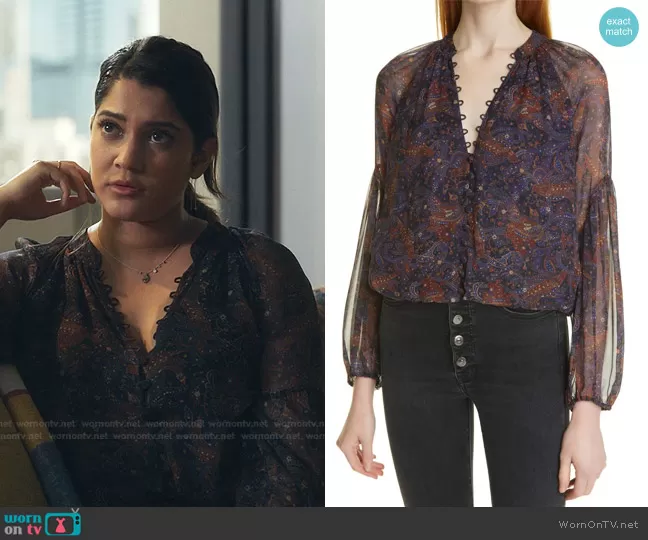 Leela Devi (played by Anuja Joshi) on The Resident on Fox was spotted wearing this Leela’s paisley print blouse on The Resident on episode 'Who Will You Be?' (5x07) in Nov 2021. Leela's Top is the Jayce Silk Blouse by Veronica Beard.
