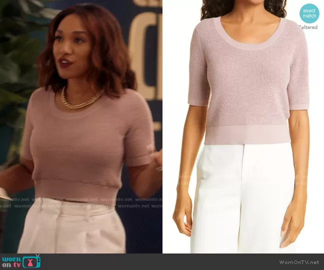 Iris West (played by Candice Patton) on The Flash on The CW was spotted wearing this pink knit crop top and white pants on The Flash on episode 'Armageddon (1)' (8x01) in Nov 2021. Iris's Top is the Waffle Stitch Wool Blend Sweater by Club Monaco . Iris's Pants is the Carrot Pants by Wilfred at Aritzia.