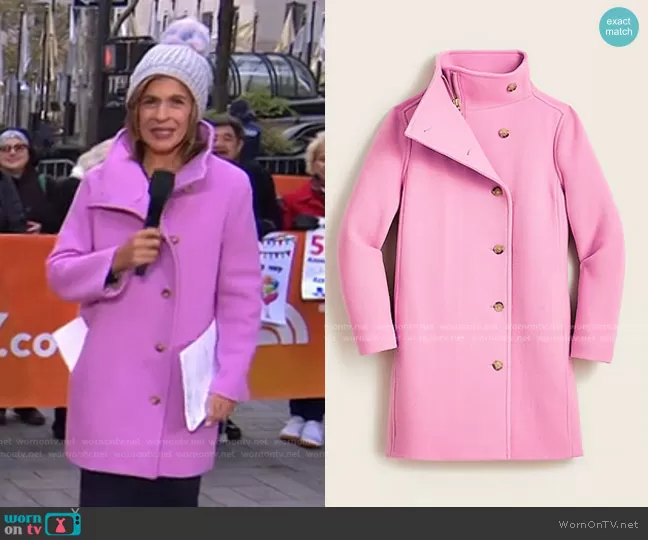Hoda Kotb on Today on NBC was spotted wearing this pink coat on Today on Jan 12 2023's episode. Hoda's Coat is the Villa Coat in Italian Stadium-Cloth Wool by J. Crew . Hoda's Hat is the Genuine Fox Pompom Hat by Kyi Kyi.