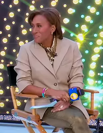 Robin Roberts on Good Morning America on ABC was spotted wearing this metallic leopard blouse and beige ruched sleeve blazer on Good Morning America on Nov 17 2021's episode. Robin's Top is the Hansen Metallic Leopard-Jacquard Shirt by Michael Kors . Robin's Jacket is the Fitted Single-Breasted Button Blazer by Michael Kors.